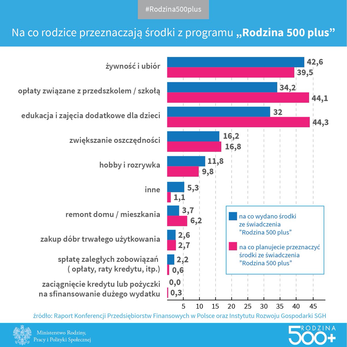 W sondażu znalazło się też pytanie, na co Polacy przeznaczają pieniądze z „Rodzina 500 plus”. Blisko 60 proc. uważa, że na jedzenie i ubrania dla dzieci. 44 proc. jest zdania, że pieniądze są przeznaczane na edukację, a 37 proc. wskazuje, że na organizację wakacyjnego wypoczynku.